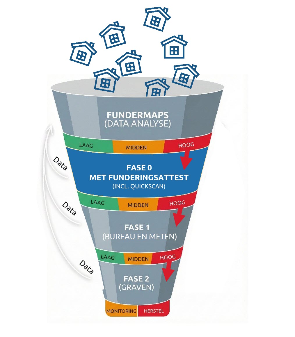 Centraal in deze aanpak staat het Fase 0 funderingsrisico onderzoek met een duidelijk funderingsattest dat in één oogopslag het funderingsrisico in kaart brengt. Omdat het Fase 0 onderzoek uitgebreider is dan de KCAF Quick Scan, is deze scan als integraal onderdeel van het onderzoek opgenomen. Het Fase 0 onderzoek vertaalt beschikbare data vanuit Fundermaps en de visuele inspectie binnen en buiten, naar concreet inzicht op woningniveau.